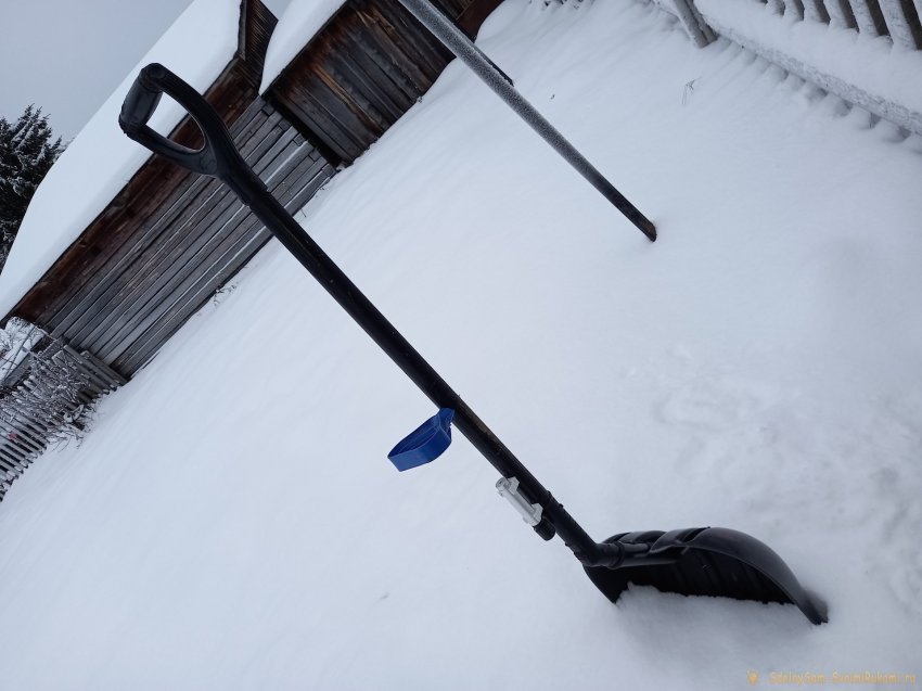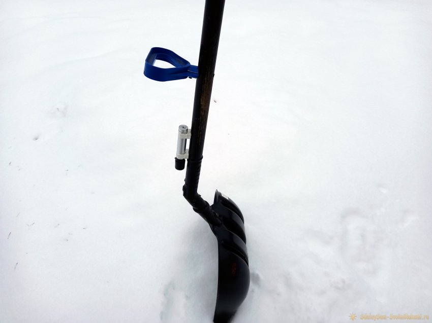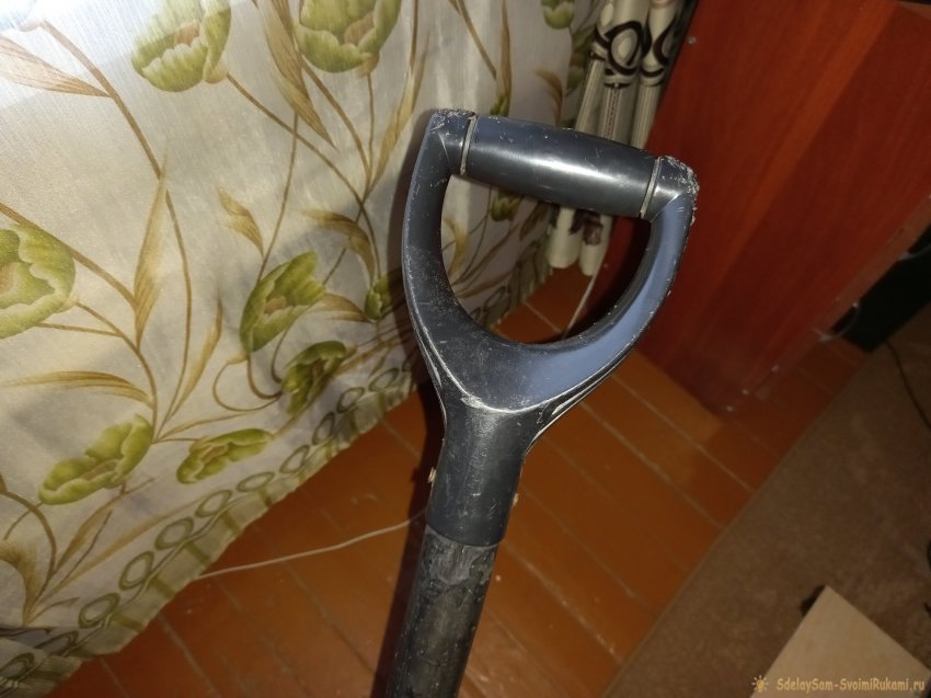 С таким углом наклона, захват снега в лопату гораздо больше, а нагрузка на плечи и спину уменьшается в разы. Ну, а чтобы уменьшить нагрузку ещё и на предплечья, мы приделаем к черенку ещё одну рукоятку. Одна рукоятка (если у Вас их на лопате вообще не было), устанавливается на окончание черенка и крепится саморезом.