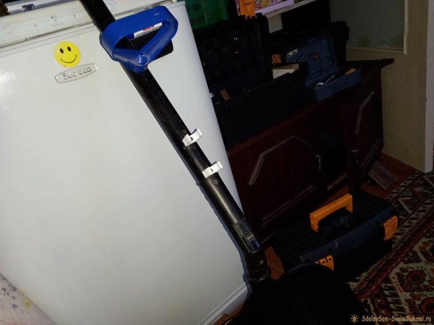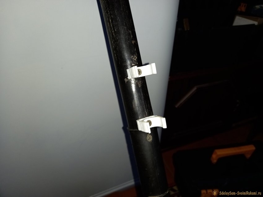 С такой конструкцией основная нагрузка приходится на трицепс, бицепс и пресс, оставляя минимальную нагрузку на поясницу. Теперь позаботимся о зрении. Точнее, об освещении в тёмное время суток. Тут всё проще некуда. Нужно просто вкрутить в черенок, сразу после отвода, пару клипс для водопроводных труб, на расстоянии в 6-8см друг от друга. Внутренний диаметр клипс должен соответствовать диаметру Вашего фонарика.