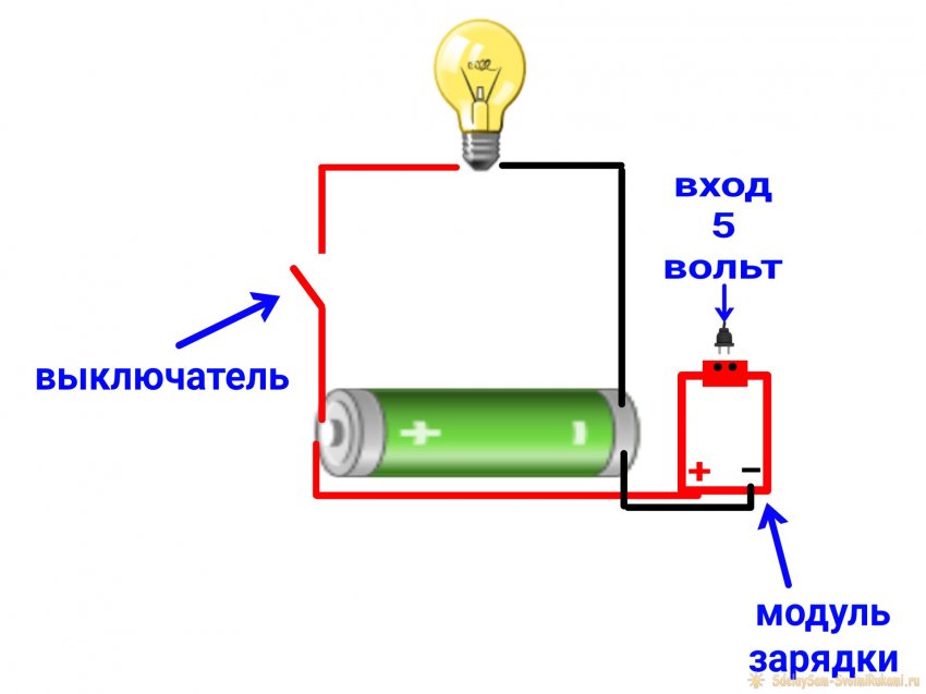 Мой фонарик, работающий от зарядного устройства (которое так же исполняло роль рукоятки фонарика), оказался для такой работы не очень удобен – слишком уж у него узконаправленный луч, рассчитанный на дальние расстояния. А зума нет. Но никогда недолго быстренько спаять светильник с нужной направленностью света. Для этого понадобится небольшая светодиодная панель с диапазоном потребления от 3 до 6 вольт, аккумулятор 18650 на 3,7-4,2 вольт, выключатель, и модуль зарядки. Ну, а спаять все составляющие в нужном порядке, я думаю, сможет любой. На всякий случай вот схема: