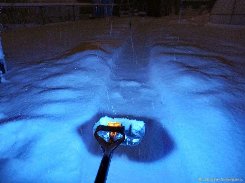 Если Вы живёте в каком-нибудь северном регионе, где зима длится полгода, где зимой световой день составляет 4-5 часов, а снег сыплет с редкими перерывами, то этот полезный совет для Вас! Утром, до ухода на работу, убрать снег с тротуара на своём участке, после снежной ночи, задача из разряда «миссия невыполнима»! Темень, хоть глаз выколи. Сначала я пользовался налобным фонариком, но для меня это не очень удобно, так как капюшон, перекрывает светоотражатель фонарика. А без капюшона в пургу на улице нечего делать. Потому, решил несколько модернизировать свою новую лопату, дабы облегчить себе работу, как в плане освещения, так и в плане уменьшения физической нагрузки на спину.