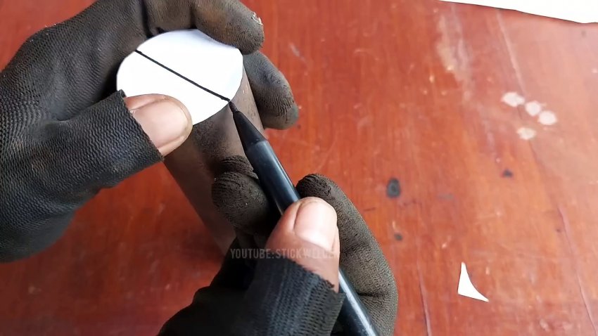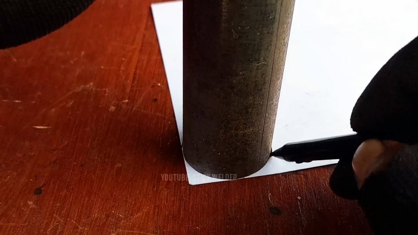 Удерживая бумажный сегмент в указанном положении на трубе, обводим дугу сегмента на боковой поверхности трубы маркером. То же самое проделываем и с противоположной стороны трубы, ориентируясь на вторую отметку, нанесенную на трубу ранее.