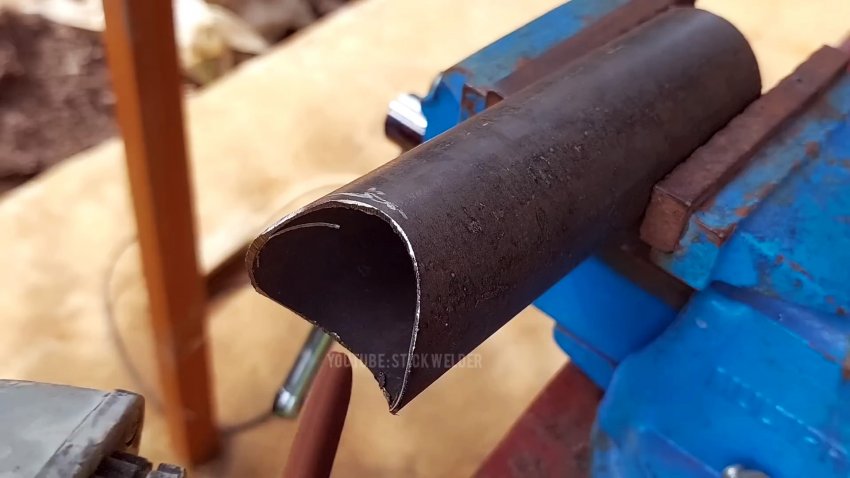 Зажимаем трубу в слесарные тиски и болгаркой вырезаем металл по нанесенным плавным линиям на боковой поверхности трубы.