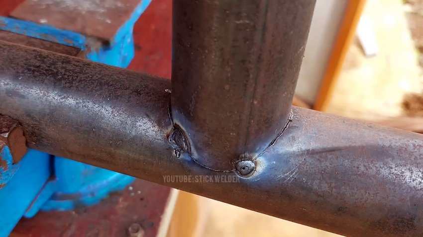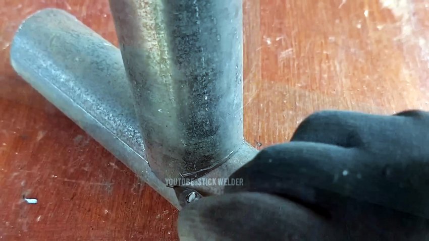 Аккуратно и качественно обвариваем плавную линию сопряжения трубных заготовок по всему периметру и получаем герметичное, прочное и эстетичное соединения двух труб одинакового диаметра точно под углом 90 градусов.