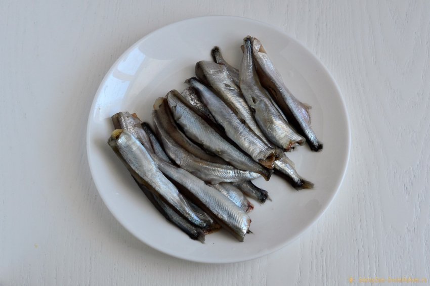 Мойву дефростируем при комнатной температуре, отрезаем головы и плавники, а затем хорошенько ополаскиваем тушки под проточной водой.