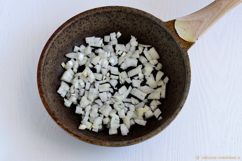 Репчатый лук очищаем и шинкуем на мелкие кубики. Размещаем на прогретую сковородку с растительным маслом. Готовим на небольшом огне до прозрачности лука.