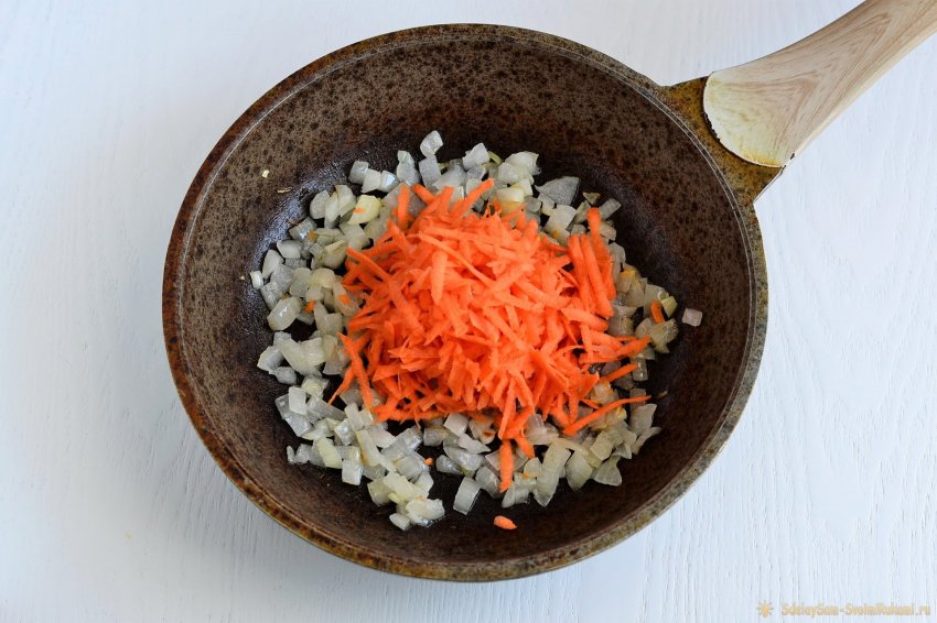 Морковку очищаем и протираем на крупной тёрке. Добавляем на сковороду к луку и продолжаем готовить ещё несколько минут, не забывая помешивать.