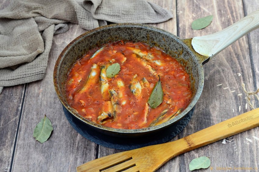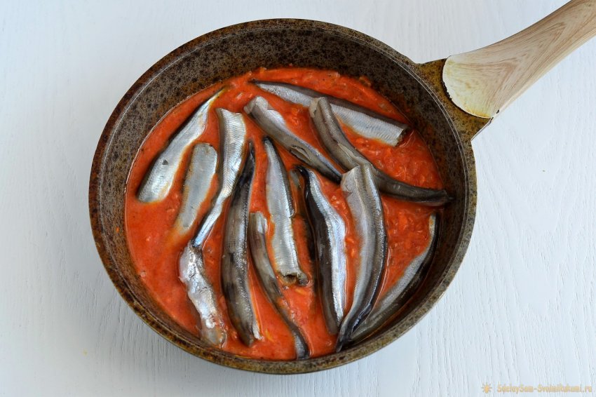 Выкладываем в соус мойву и накрываем крышкой. Готовим около 15 минут на малом огне.