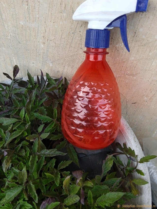 Перелейте рабочий раствор настоя алоэ в ручной пульверизатор и опрыскайте всю томатную рассаду по листьям в утренние или вечерние часы. Первый раз некорневую обработку рекомендуется проделывать после того, как на саженцах появится первая пара настоящих листьев. Интервал между некорневыми орошениями помидоров — 7-10 дней.