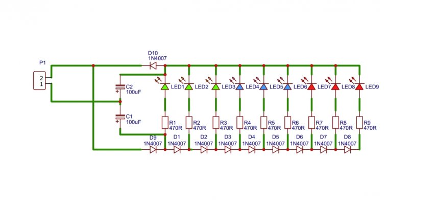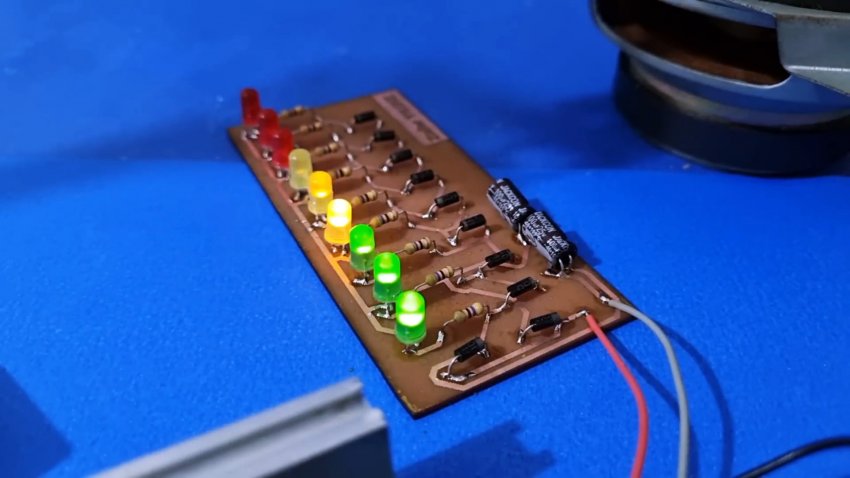 Существуют схемы простейших индикаторов уровня сигнала, которые не содержат транзисторов и микросхем. Для их работы не требуется даже источник питания. А время, затраченное на сборку, не превысит 20 - 30 минут. Хотя, если честно, в итоге получится простое светомузыкальное оформление, например, колонки. О точности таких индикаторов говорить не приходится. Соберем одну из распространённых схем, кочующих по просторам Интернета.