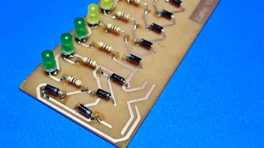 Из них собирается своеобразная «лесенка», на каждой «ступеньке» которой падение напряжения составит около 0,3 Вольта. И будет гореть соответствующий светодиод.