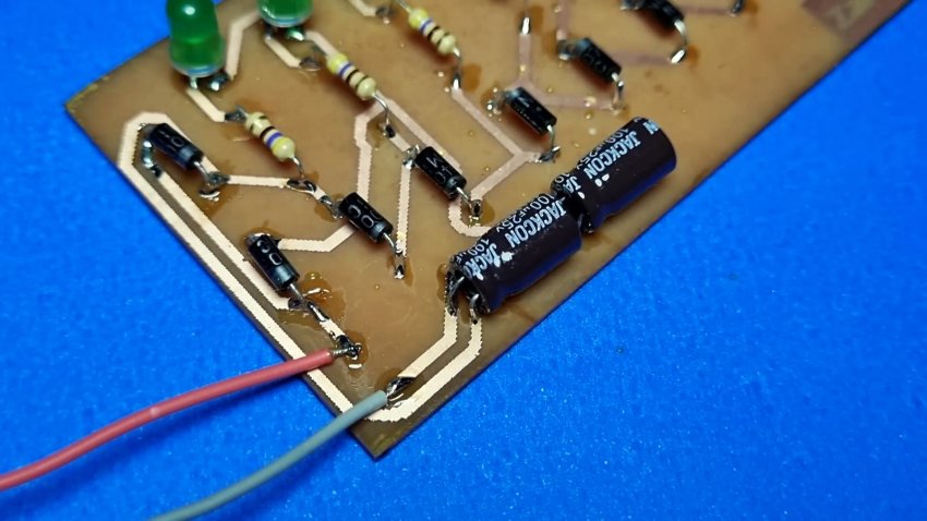 Для ограничения тока светодиодов потребуются резисторы. Их номинал 470 Ом. Детали устанавливаются на плату и запаиваются. Теперь очередь диодов. Использованы 1N4007.