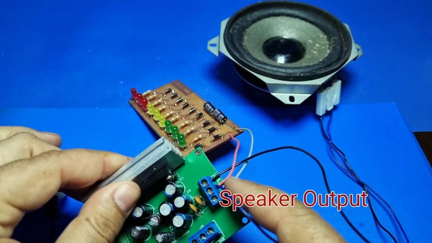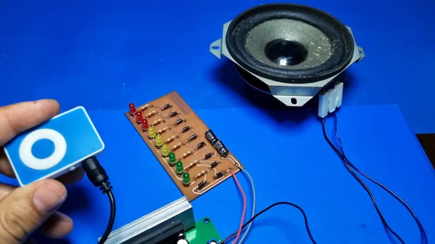 Удобно снимать сигнал с выводов динамика. Разноцветные огоньки мигают в так музыке. Устройство работает.