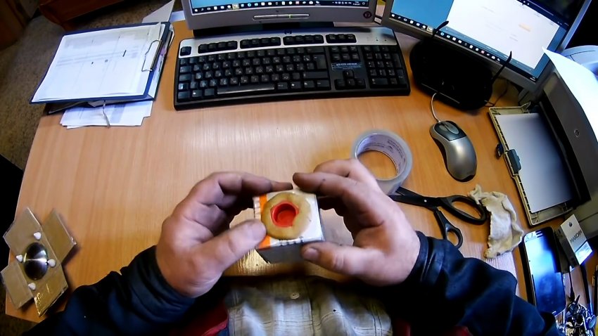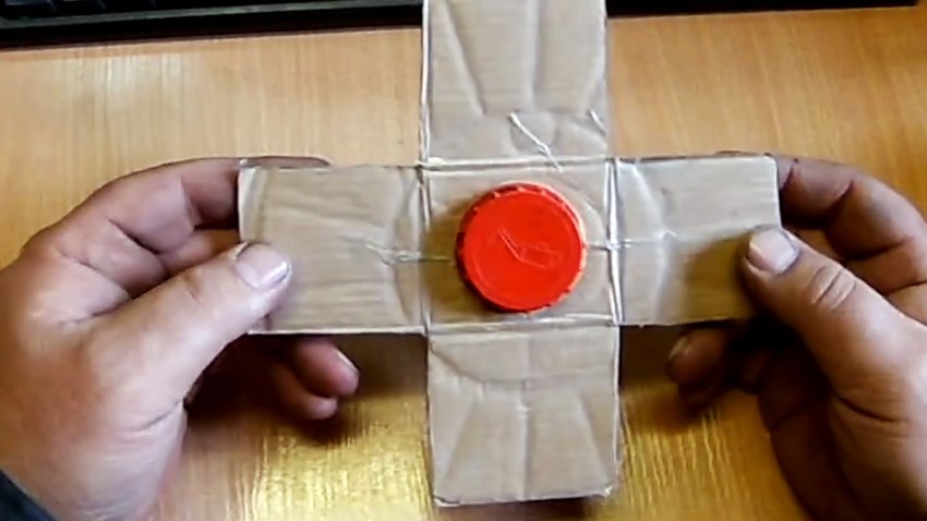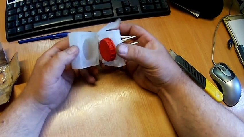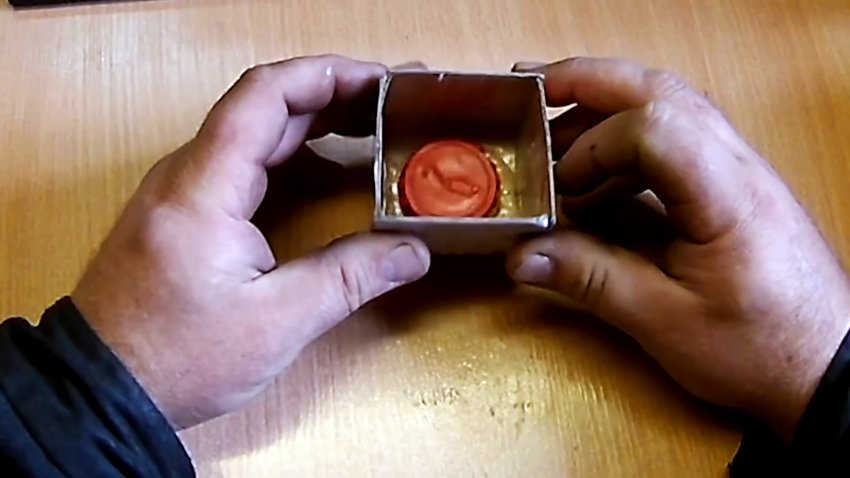 В центре пластмассовой крышки делаем из пластилина заглушку и восстанавливаем отсутствующий бортик. Используем зубочистки с кусочками пластилина на кончике. Снова собираем с помощью скотча картонную коробочку.