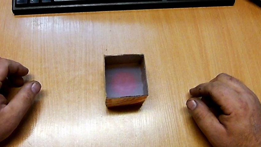 Из обыкновенного плотного картона выполняем полную развертку коробки нужных размеров, но без верхнего клапана. В ее донце выполняем отверстие под крышку-шаблон и закрепляем ее с внутренней и наружной стороны обычным детским пластилином. Картон изнутри аккуратно обклеиваем скотчем, чтобы при формовке и затвердевании не прилипал силикон.