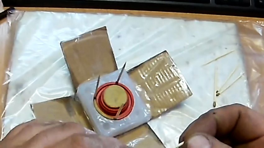 В соответствии с инструкцией завода-производителя разводим силикон и по возможности делаем его дегазацию. Заливаем жидкий силикон в коробочку и после затвердевания вновь разбираем ее. Отделяем верхнюю часть формы от нижней, удаляем зубочистки и обрезаем ножницами облой и лишний материал.
