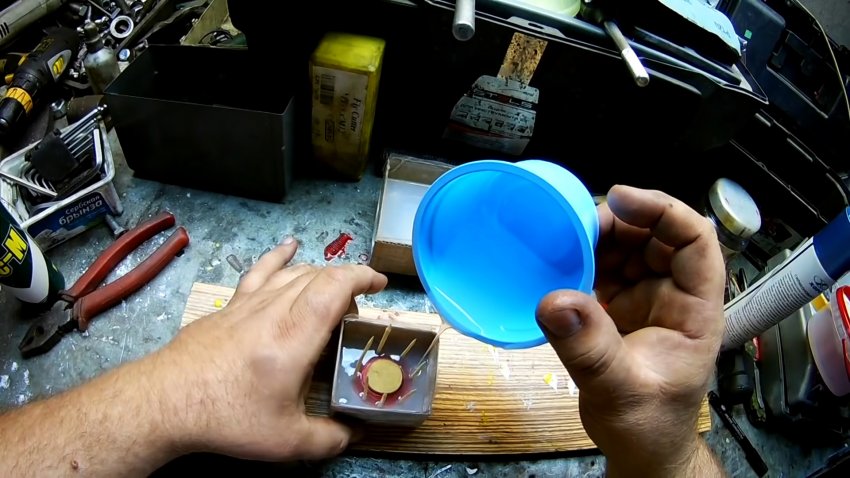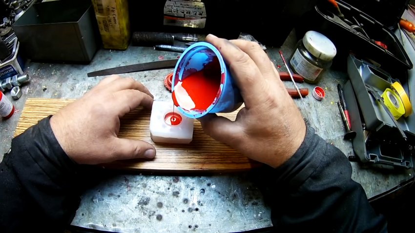 Заливаем в форму двухкомпонентную эпоксидную смолу или жидкий пластик тонкой струйкой, чтобы не захватывать атмосферный воздух, немного потряхиваем форму и перемешиваем ее содержимое концом проволоки как для уплотнения массы, так и удаления случайно попавшего в формуемый материал воздуха.