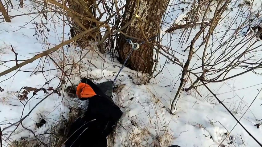 Один конец веревки закрепляем на транспорте, другой – к дереву. Для безопасности на веревку после зацепа к дереву и транспорту наматываем куски брезента или старую верхнюю одежду типа куртки или фуфайки. Это защитит нас, если веревка отцепится или порвется в процессе натяжения.