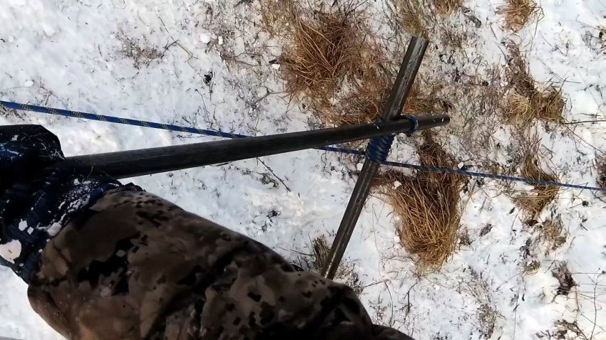 Примерно посередине подтягиваем веревку к себе, укладываем один рычаг параллельно веревке, а другой – поперечно на веревку и нижний рычаг, причем ближе к их краям. Намотку веревки на верхний рычаг осуществляем со стороны, которая длиннее.