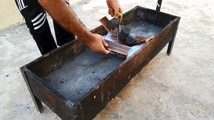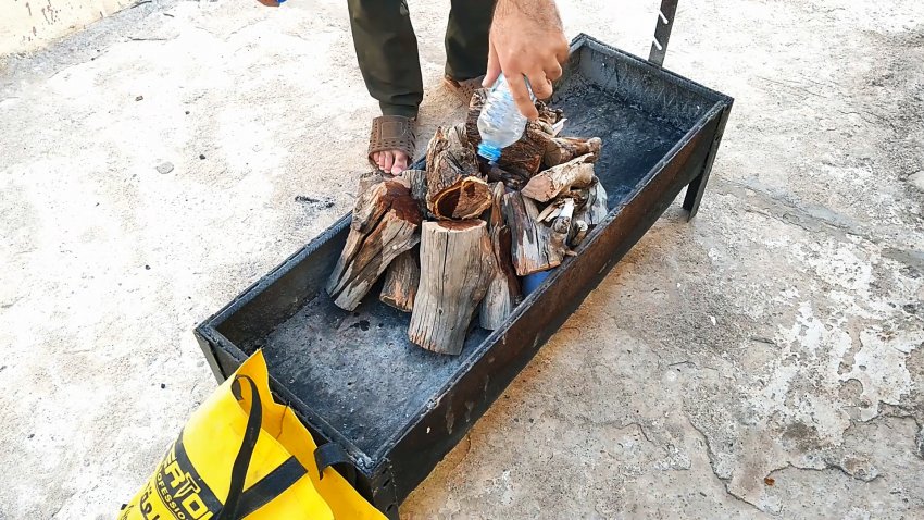 Укладываем поленца вперемешку с бумагой в мангал, сверху поливаем горючей жидкостью и поджигаем. Дожидаемся того момента, когда все дрова прогорят и распределяем древесный уголь по всему мангалу.