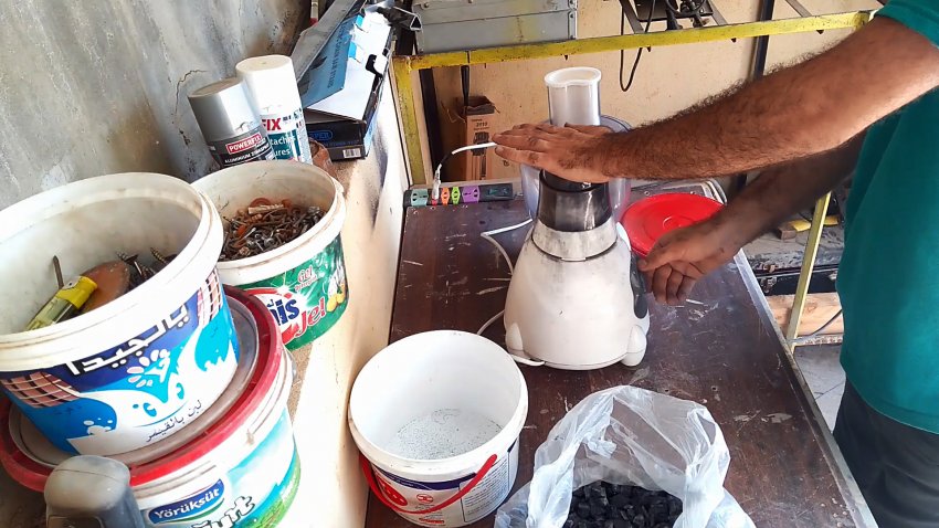 Загружаем порционно древесный уголь в блендер и превращаем его в порошок. Добавляем к нему 0,5 кг пищевого крахмала и оба компонента тщательно перемешиваем в емкости. Затем постепенно вливаем в полученную гомогенную смесь 1 литр воды и также хорошо перемешиваем.