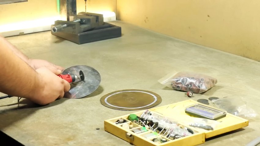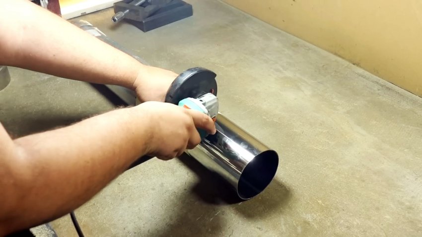 Среди остатков нержавеющей трубы, использованной ранее для изготовления печного дымохода, разного диаметра и длины толщиной 0,5-1,0 мм, отыскиваем отрезок примерно подходящий по длине. Понадобятся несколько плоских сегментов, которые можно получить из обрезков труб, разрезав их в продольном направлении, и разгладив на деревянной доске. Проводим на ней 2 окружности, используя в качестве шаблона выбранный отрезок нержавеющей трубы.