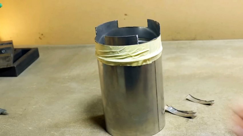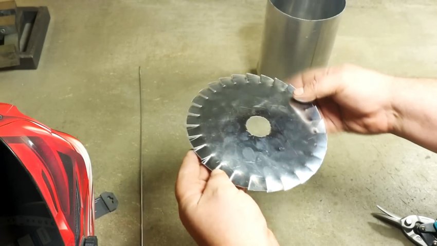 Низ будущей печки готов. Круг большего диаметра ножницами по металлу надрезаем в радиальном направлении с равным шагом до ранее проведенной окружности.