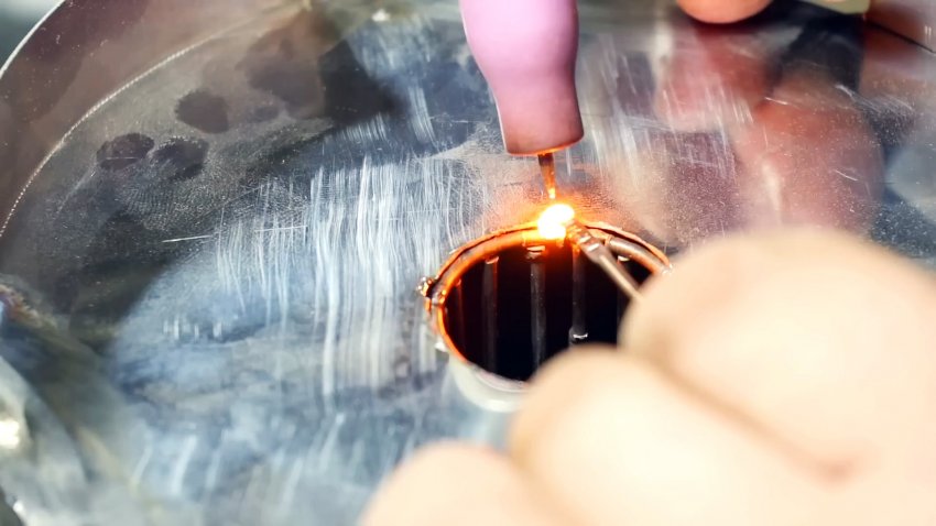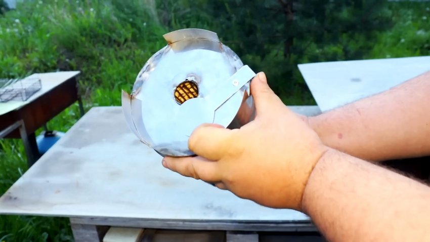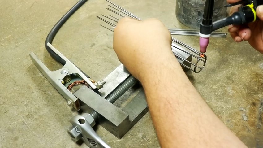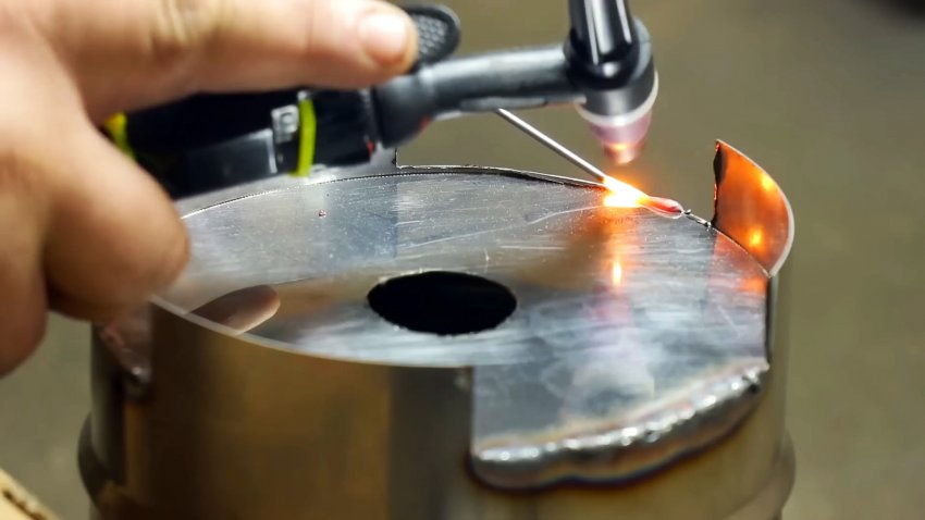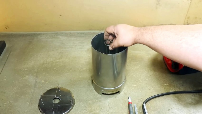 Из этой же проволоки изготавливаем с помощью сварки круглую сетку и привариваем ее к контуру отверстия в дне печки.