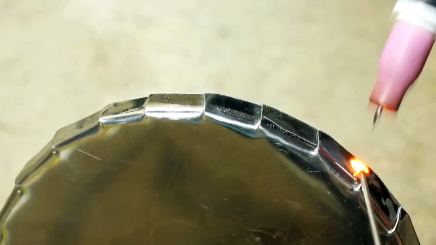 Полученные лепестки постепенно сгибаем пассатижами, пока между ними и основанием не образуется угол в 90 градусов. Прорези прихватываем сваркой для прочности и сохранения формы крышки. Полученную крышку надеваем на трубу, к которой снизу уже приварен под.