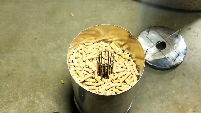 Будем испытывать печь в деле. Для этого засыпаем в нее топливные пеллеты и закрываем крышку.