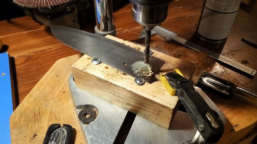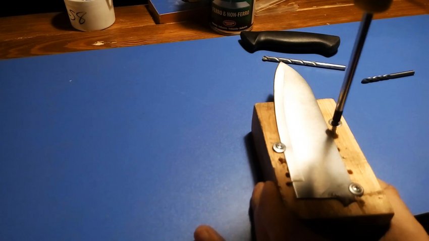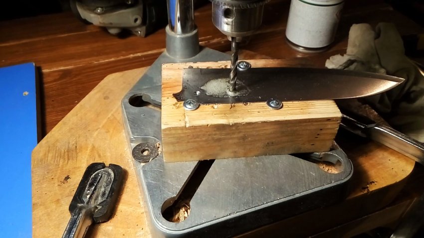 Для удобства сверления закрепляем клинок ножа к деревянному бруску с помощью трех шурупов, шляпки которых и будут удерживать обрабатываемую сталь.