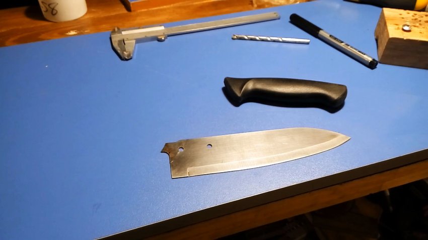 Сверлим 2 отверстия в районе хвостовика, которые необходимы для закрепления новой ручки к клинку ножа.