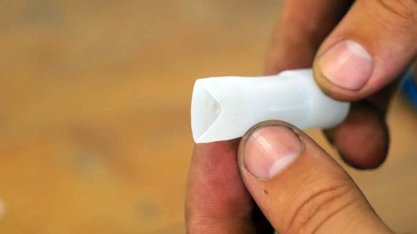 Отрезаем от пластиковой бутылки верхнюю часть с крышкой и дужкой. Натягиваем ее на круглую трубу и, нагревая газовой горелкой, разглаживаем ребра жесткости.