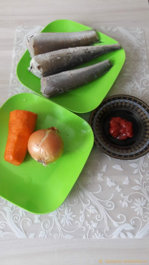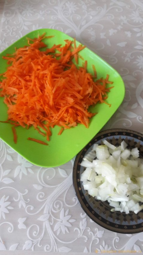 Выкладываем рыбу на тарелку. И можно будет потушить овощи. Лук репчатый режем мелко, морковь трем на крупную терку.
