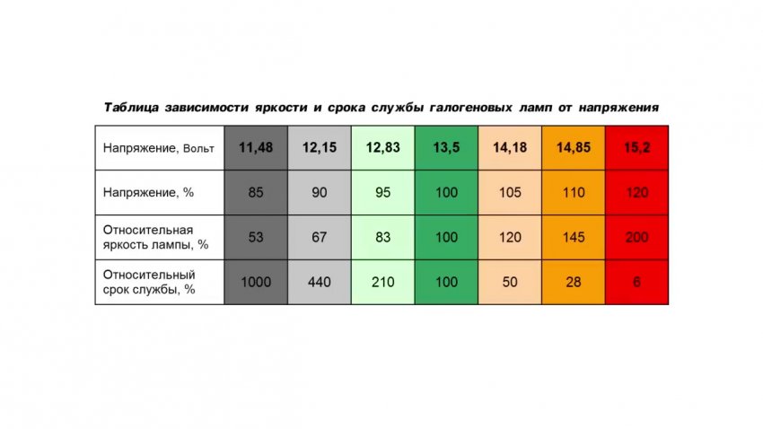 Как оказалось, при напряжении 13,5 В баланс получается идеальный. Яркость и ресурс лампочек достигает 100%. Поэтому напряжение, которое есть на клеммах аккумулятора, автопроизводители несколько снижают при подводе к лампам.