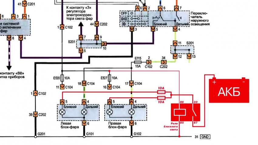 Здесь должен появляться плюс при включении ближнего света подрулевым переключателем. Таким образом, он дополнительно разгружается, т. к. на многих машинах подрулевой переключатель силовой и по нему протекает ток в 10 А, от чего подгорают контакты.