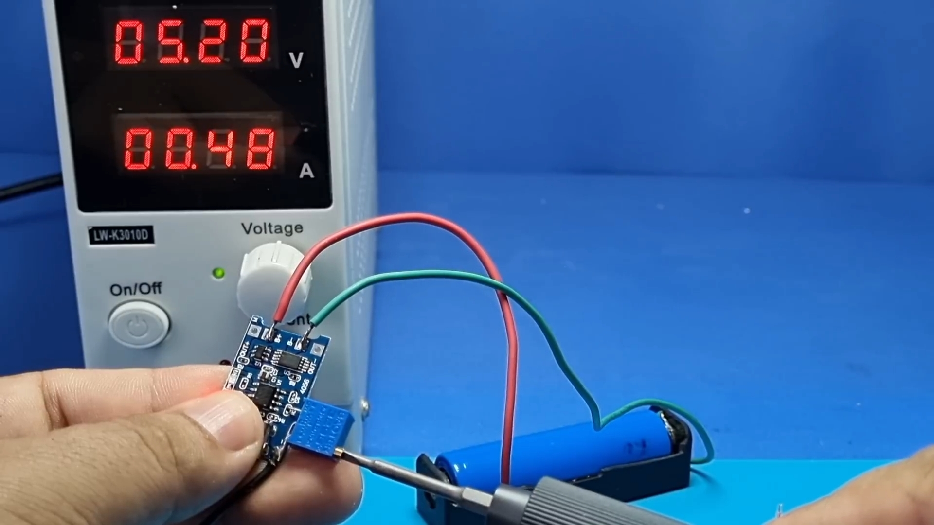 Подаем питание и вращением ручки резистора добиваемся тока зарядки 200 мА.
