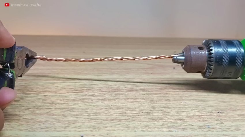 Необходимо срезать с них изоляцию строительным или канцелярским ножом. Теперь нужно скрутить три проволоки воедино. Для этого используем плоскогубцы. Затем при помощи шуруповерта формируем надежную скрутку. Если у вас нет дрели или шуруповерта, можно смотать проводники вручную.