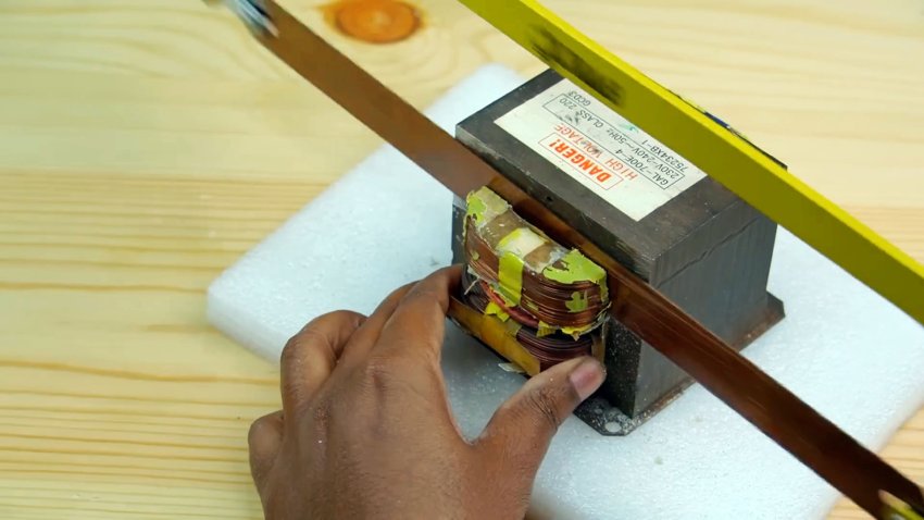 Вторичную обмотку спиливаем ножовкой. Так как трансформатор был повышающий, вторичная обмотка имеет меньший диаметр проволоки и большее количество витков. Небольшую обмотку накала катода магнетрона тоже удаляем.