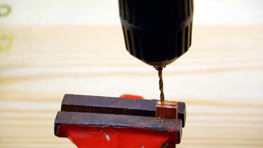 В тиках зажимаем отрезок 7 см и 1 см вместе и просверливаем посадочное место для тонкого электрода.