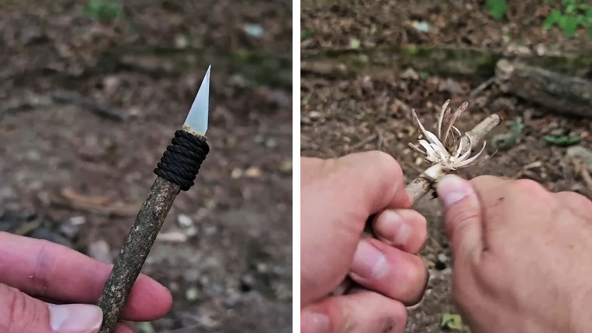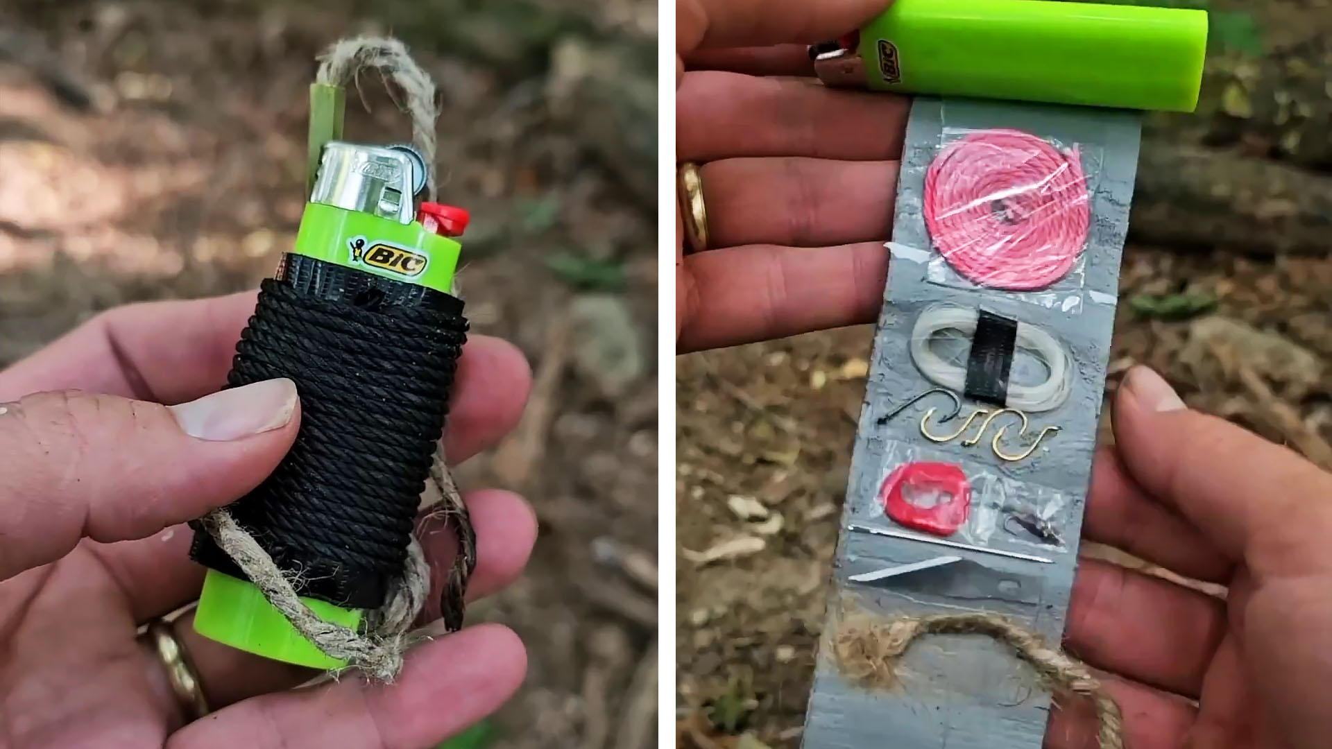 Зажигалку я обмотал прочной синтетической веревкой, которая может пригодиться в разных ситуациях. Сверху я добавил клейкую ленту. Внутри находится лезвие ножа, которое можно прикрепить к палке. Его можно использовать как маленький, но острый нож.