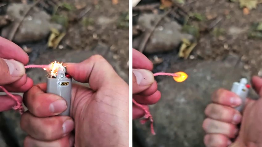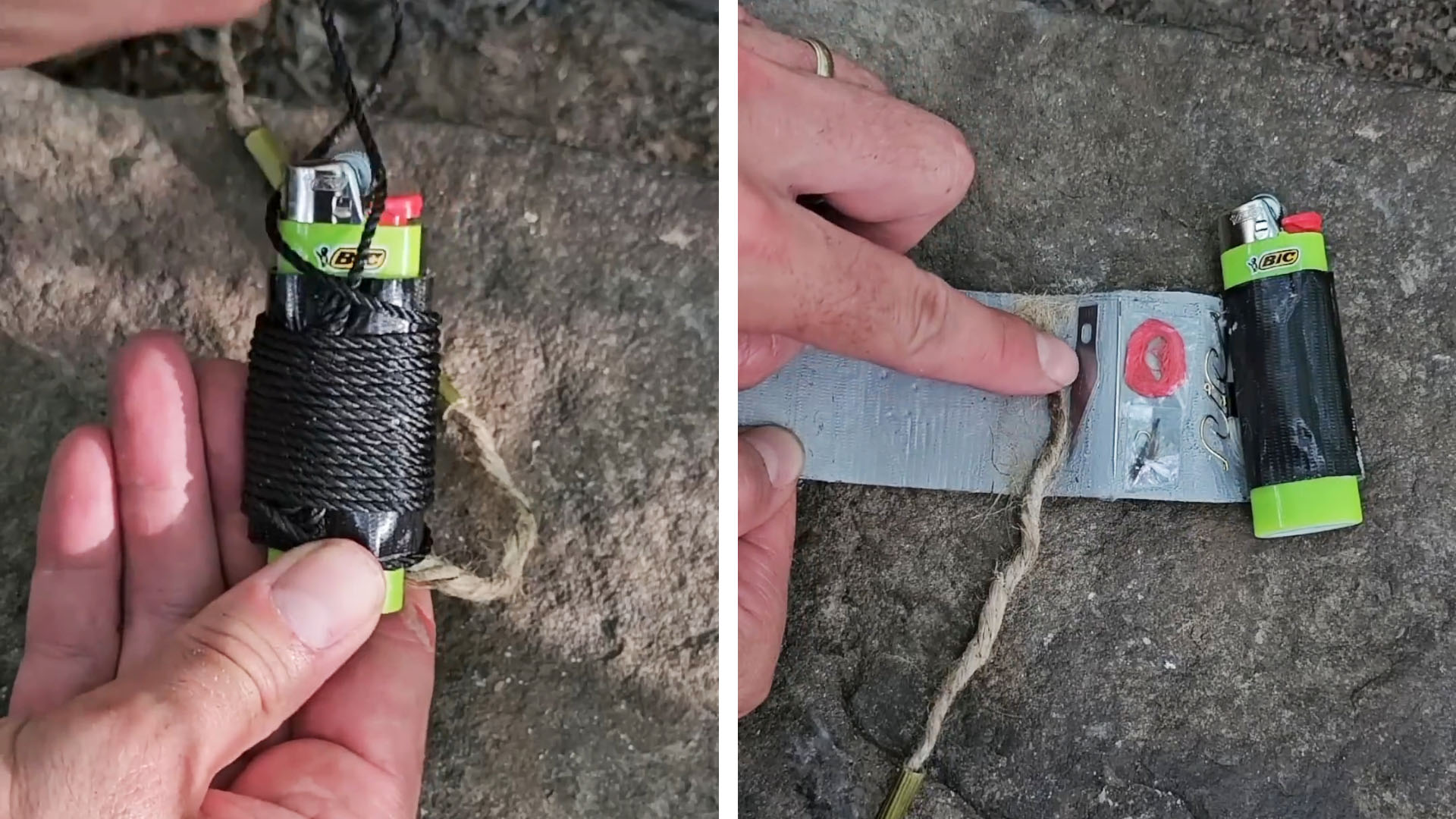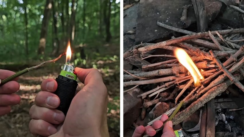 За основу взята обычная зажигалка. К ней прикреплен отрезок джутовой бечевки, пропитанной воском. Это дает более яркое и устойчивое к ветру пламя по сравнению с обычной зажигалкой. Она отлично подходит для разведения костра в плохую погоду.