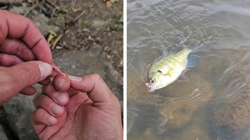 Рядом лежит рыболовный набор: мушка, крючки и леска. Также у меня есть розовая хлопчатобумажная пряжа, которую можно использовать как приманку для мелкой рыбы.