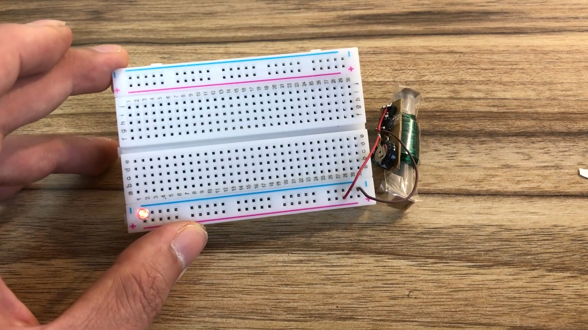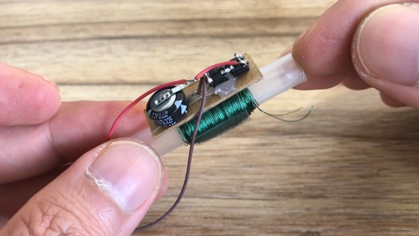 Для проверки к выводам катушки подключим светодиод. Вставим магниты и потрясем. Светодиод мигает, значит все в порядке.