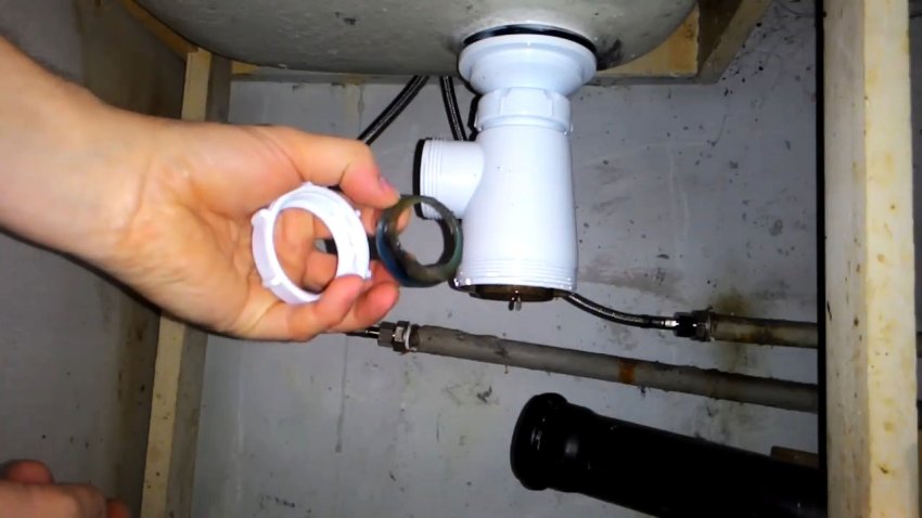 Снимаем сифон и промываем его. Ослабляем верхнюю гайку, снимаем уплотнительную резинку и саму гайку. Прочищаем всё. После промывки собираем сифон обратно: сначала гайку, затем резинку, которая идёт под конус. Вставляем сифон и слегка затягиваем гайку, чтобы он вращался.