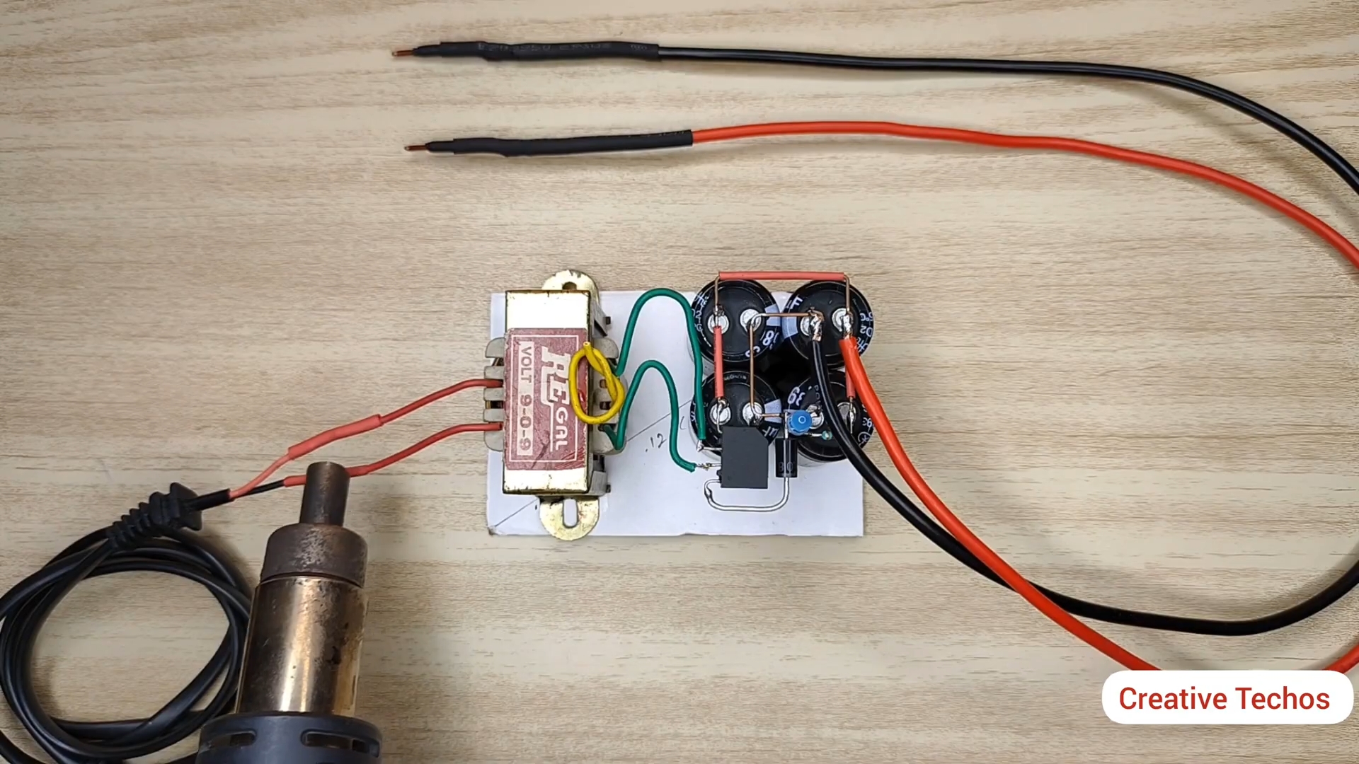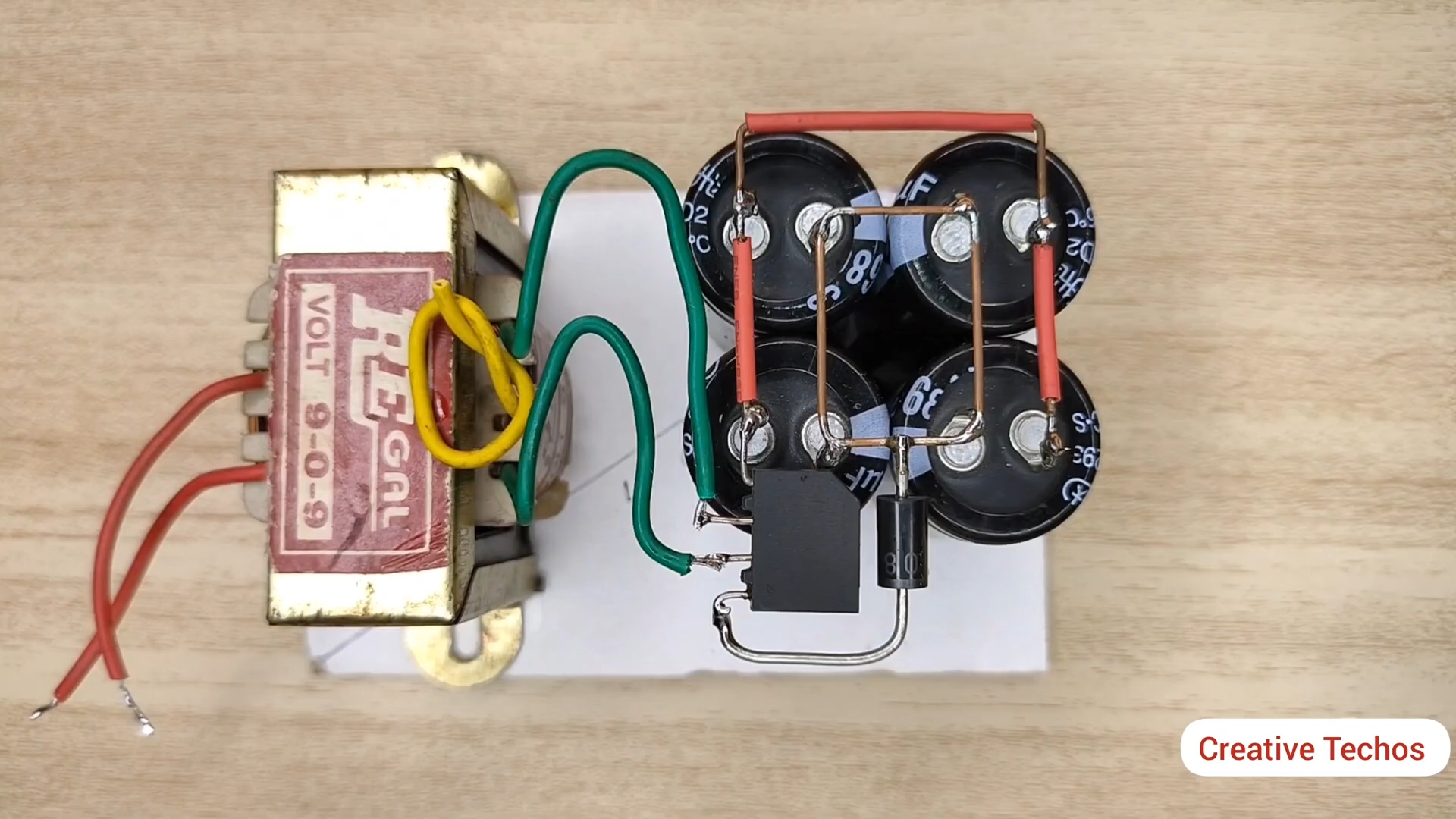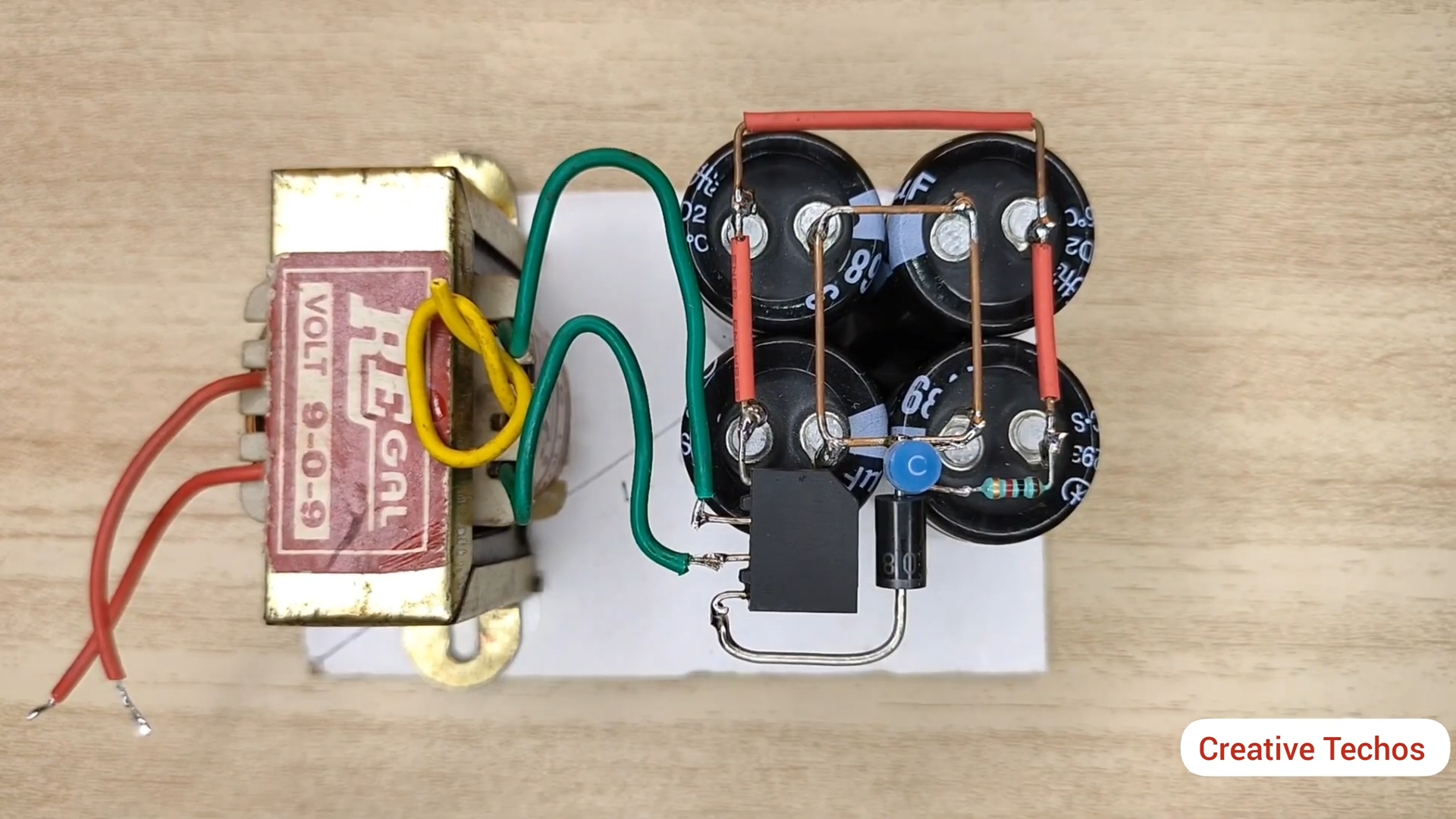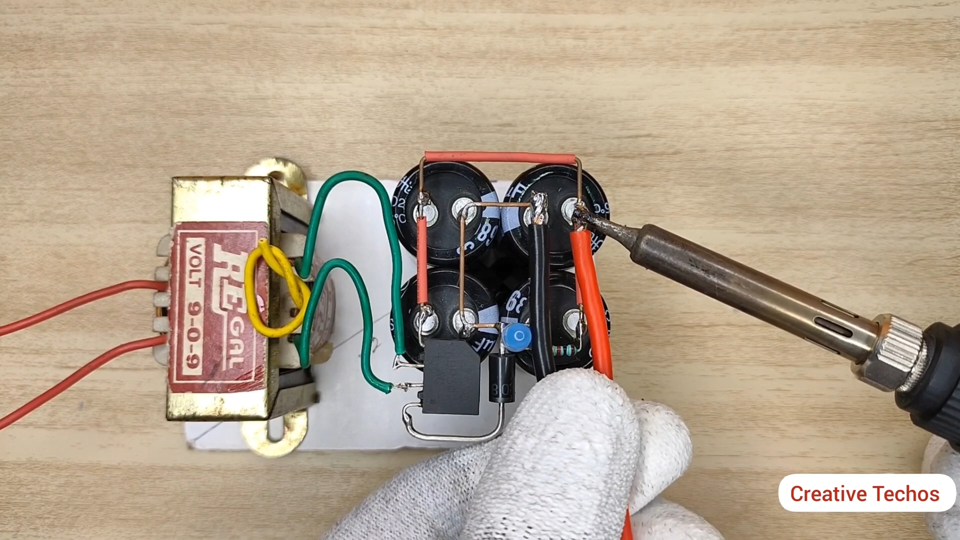 Припаиваем вторичную обмотку от трансформатора к диодному мосту и к конденсаторам согласно схемы.