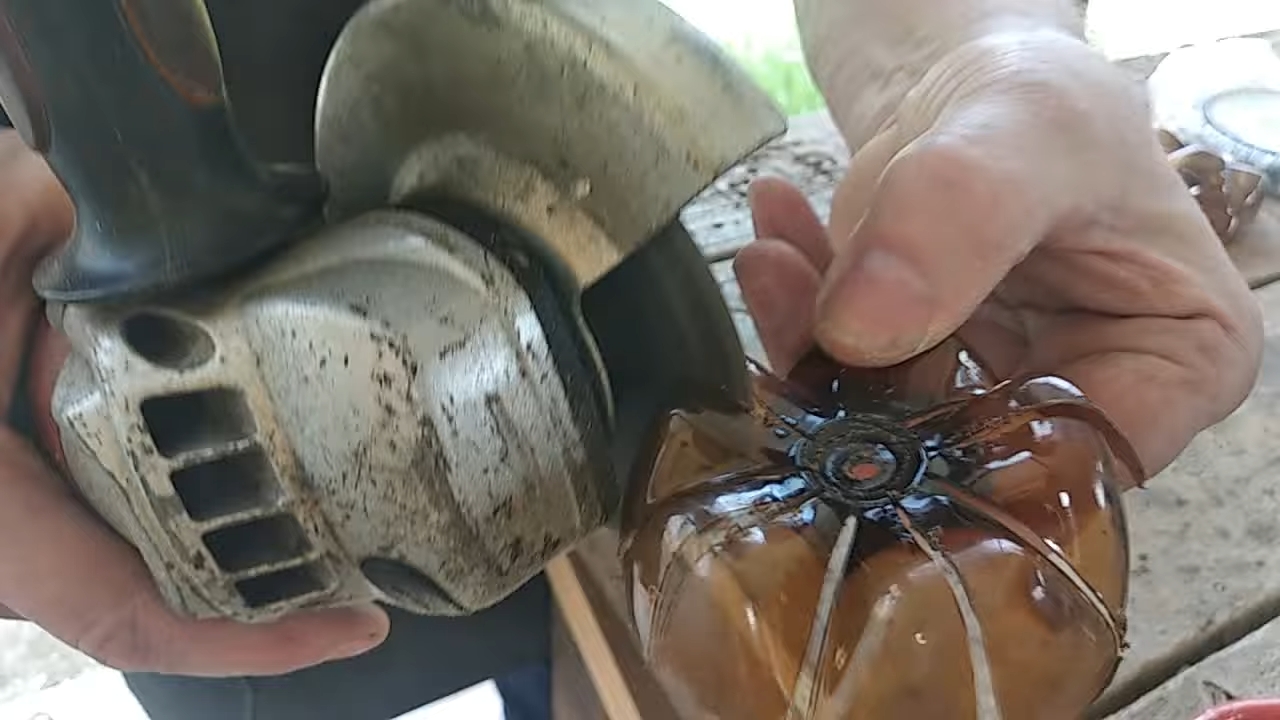 Первым делом необходимо сделать вертушку из донышка бутылки. Отрежьте низ у ПЭТ бутылки. Затем в центре донышка просверлите отверстие сверлом нужного диаметра — разметка не нужна. Если впадины нет, сначала отметьте центр.