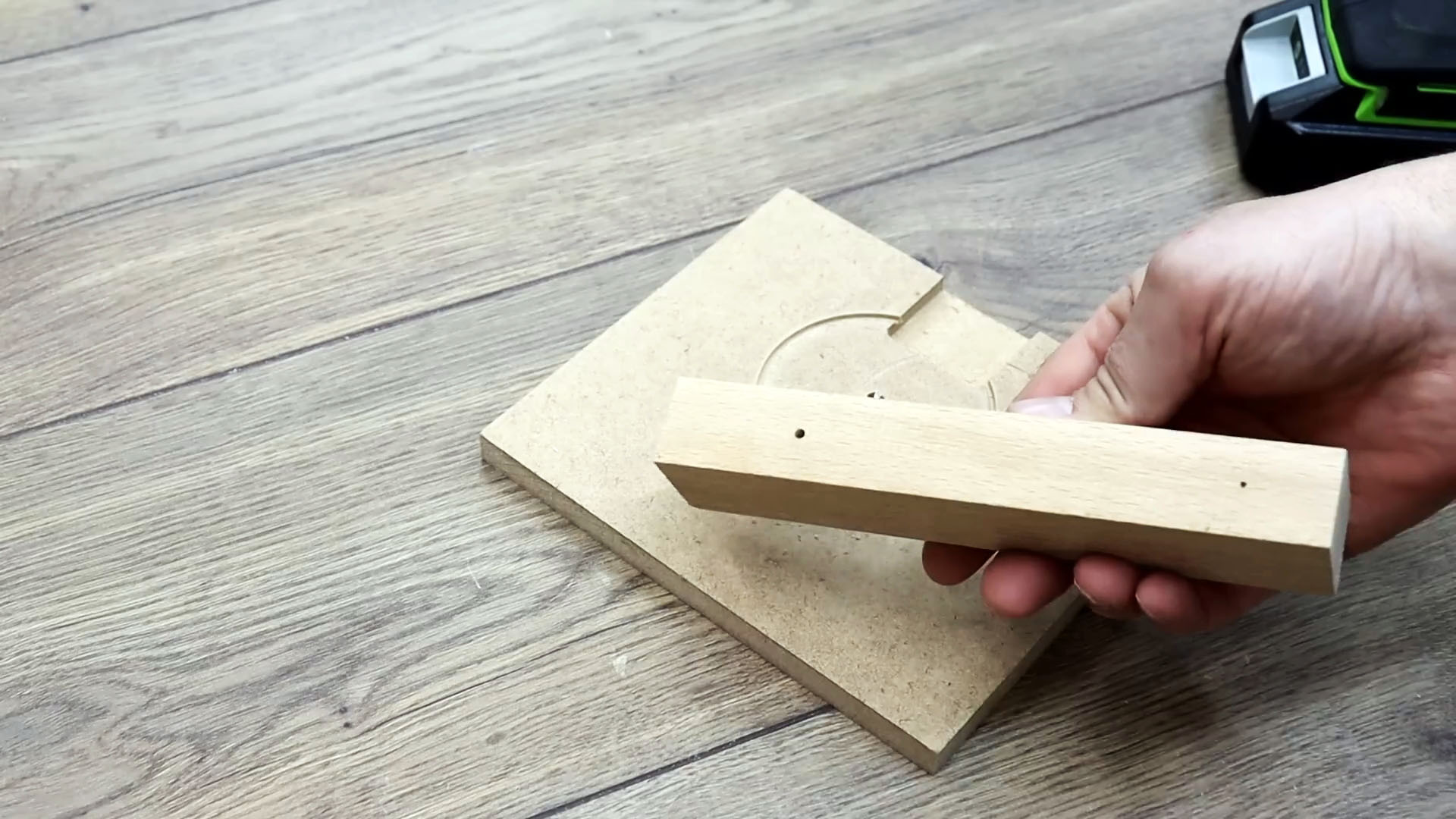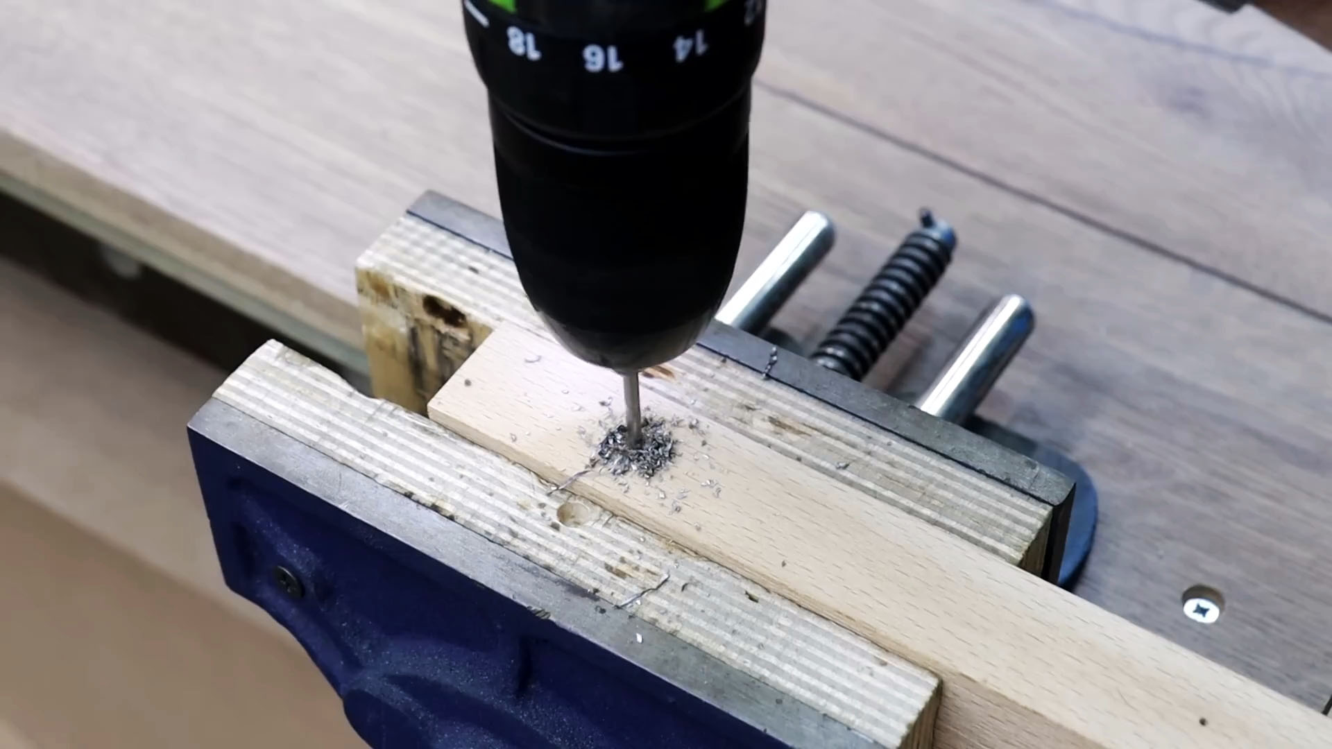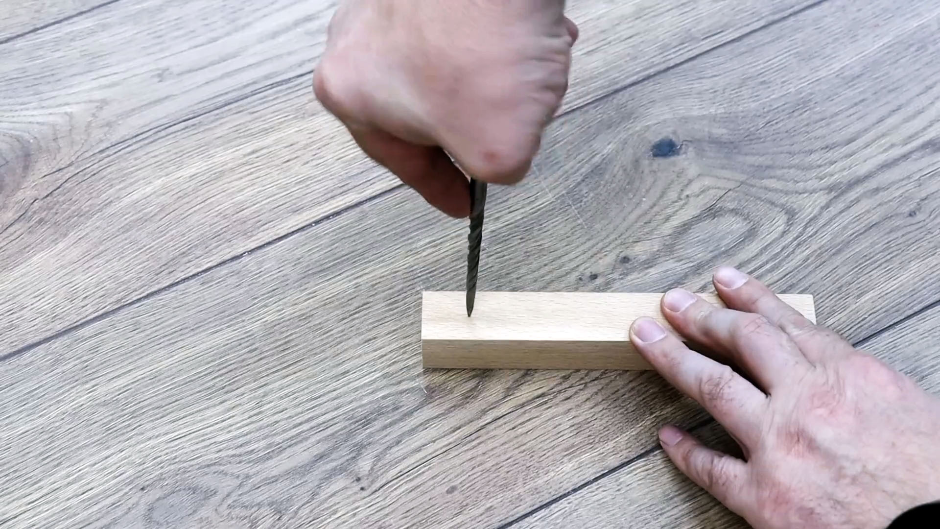 С обратной стороны бруска сверлим отверстие тонким сверлом, также используя кондуктор.