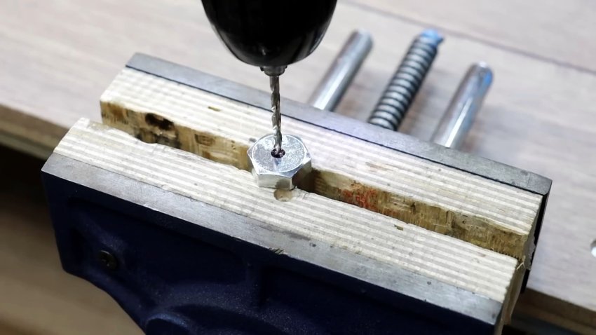 И, зажимая в тиски, сверлим сквозное отверстие в необходимом болте.