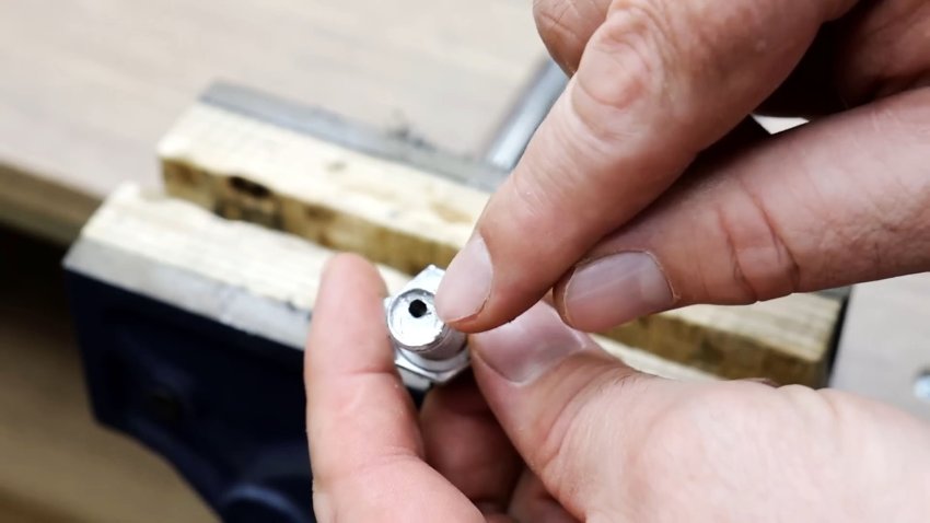 В результате получается брусок с глухим резьбовым отверстием, где по центру просверлено тонкое сквозное отверстие.