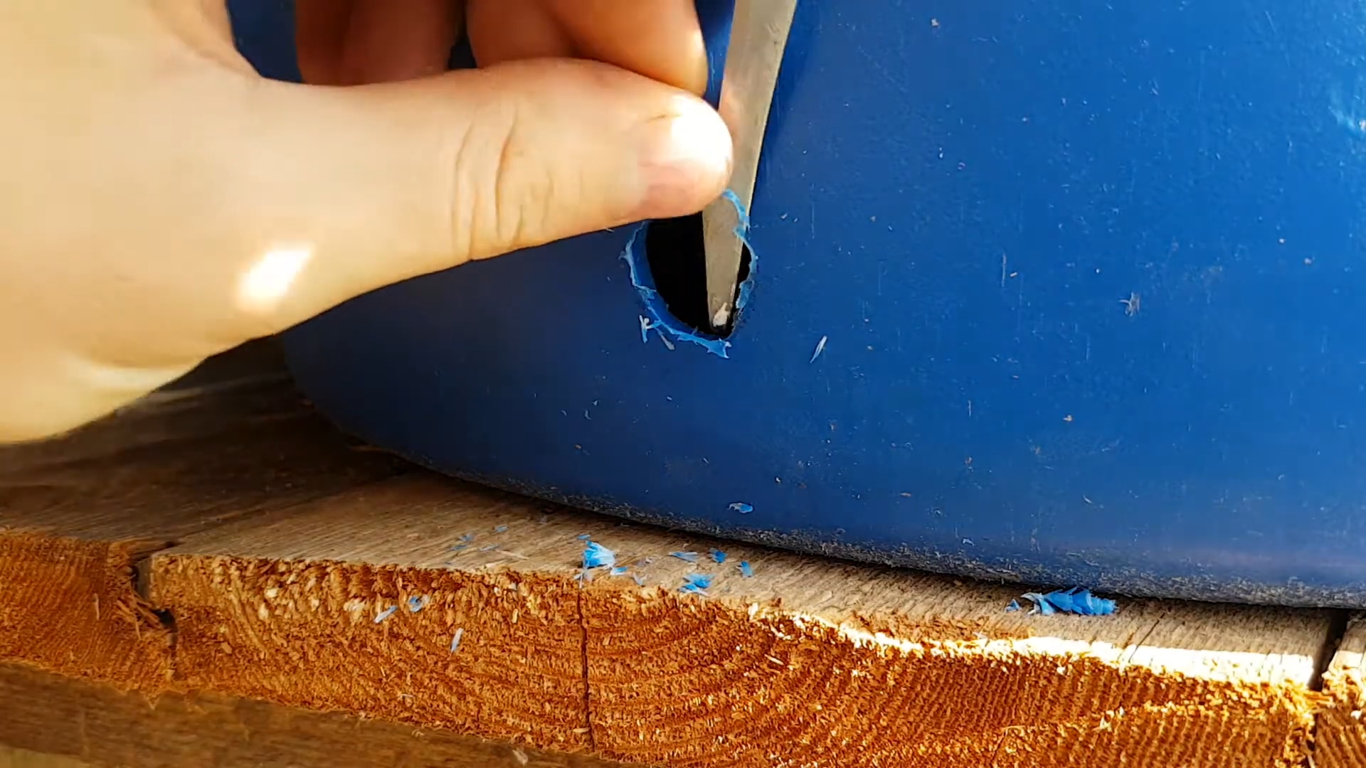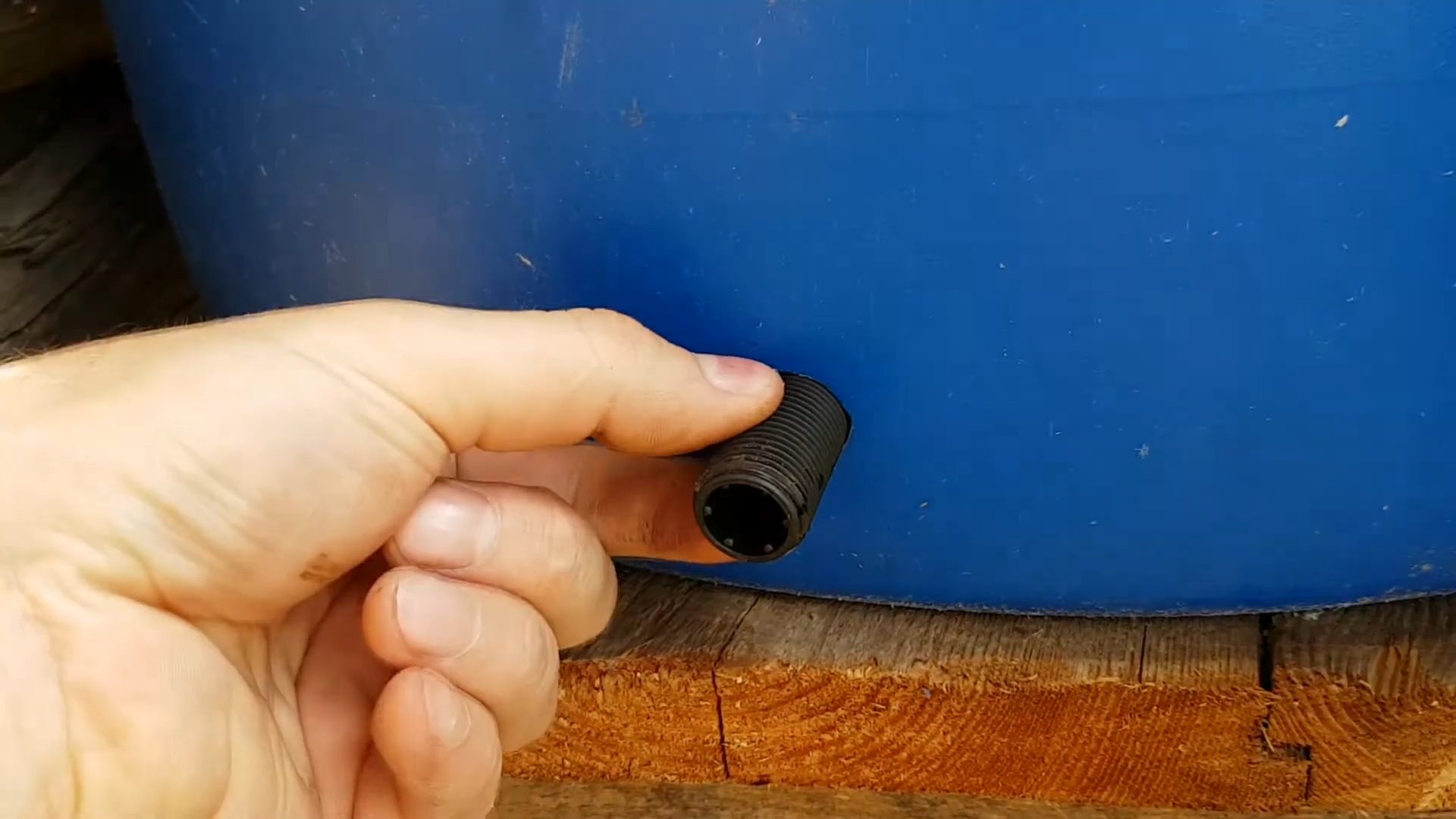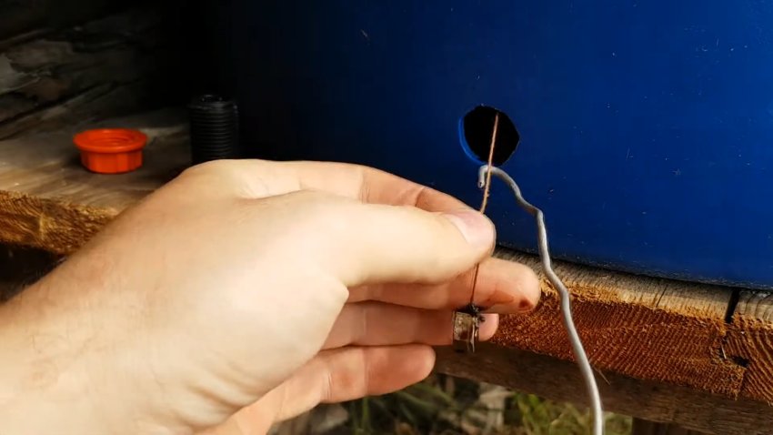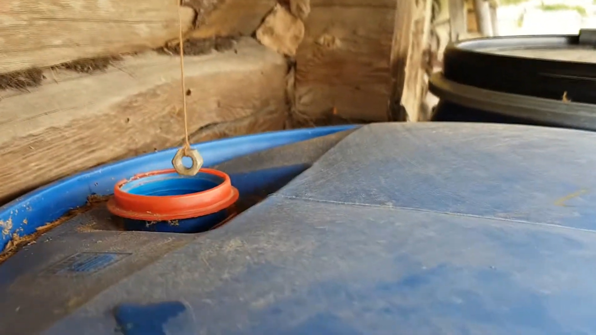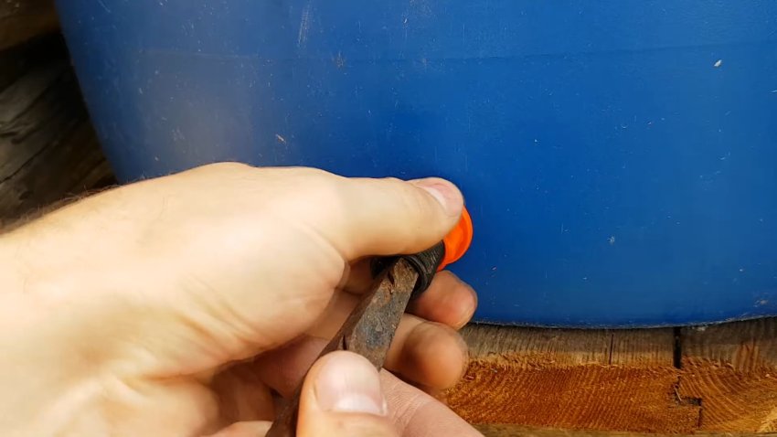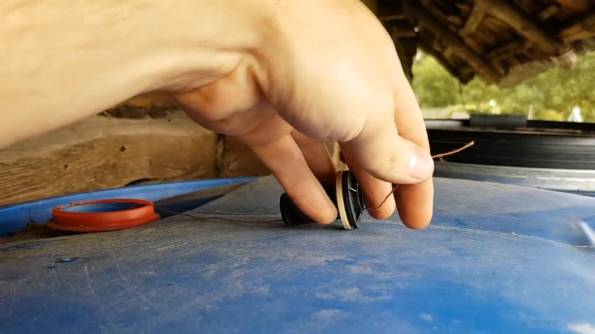 Теперь всё готово для установки врезки. Возьмите нитку, прикрепите к ней что-нибудь тяжёлое и опустите до дна бочки.